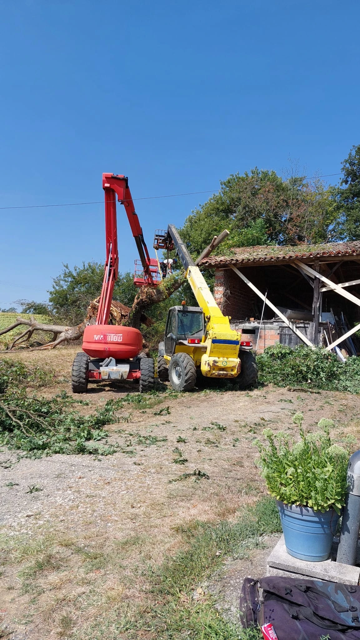 mise en sécurité du tronc avec la manuscopique et démontage branche pas branche à la nacelle. finition du broyage des branches et coupe des derniers billon de chêne, ratissage + nettoyage + souffleur